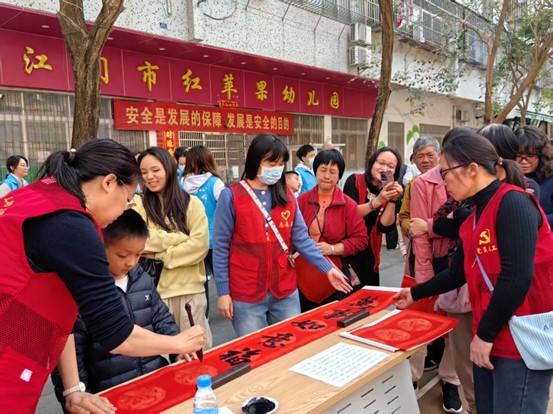 活动现场,4张书桌整齐排开,江门开放大学的老师们早已就绪,凝神挥毫。笔尖在春联纸上流转,或遒劲有力,或温婉雅致,一幅幅饱含新春祝福的春联跃然纸上。一旁的居民排起了长队,老人们捧着刚写好的春联细细端详,脸上满是笑意;孩子们好奇地围着书桌,看墨汁晕染出吉祥的文字,不时发出赞叹。党员义工们耐心询问居民需求,按需定制春联内容,指尖的温度透过笔墨,传递着党组织的关怀。