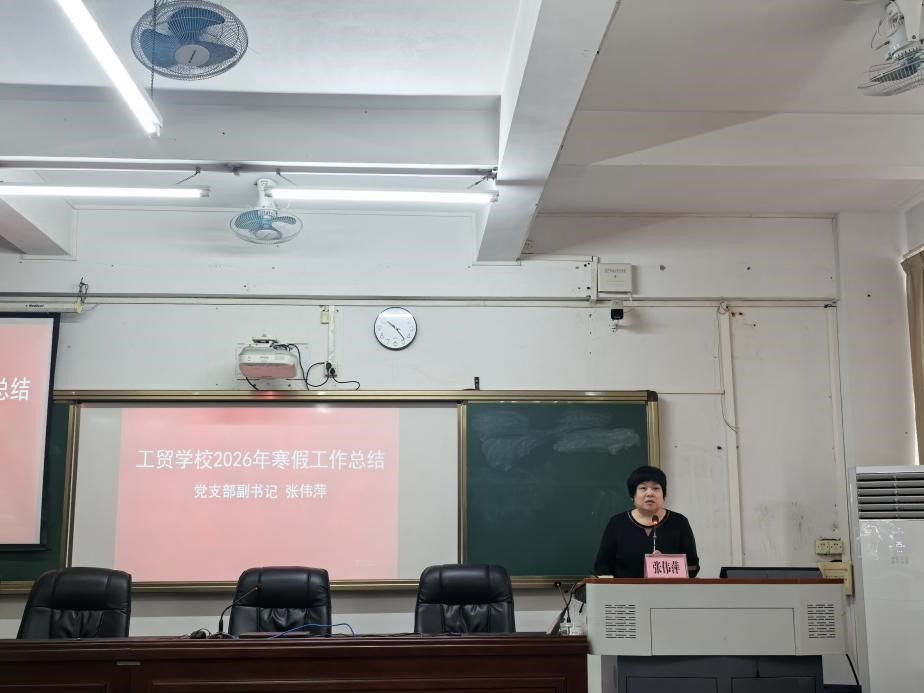 张伟萍副书记作2026年寒假工作总结,全面回顾寒假期间工贸学校各项工作开展情况,充分肯定教职工的辛勤付出与工作成效,为新学期工作优化提升指明改进思路。