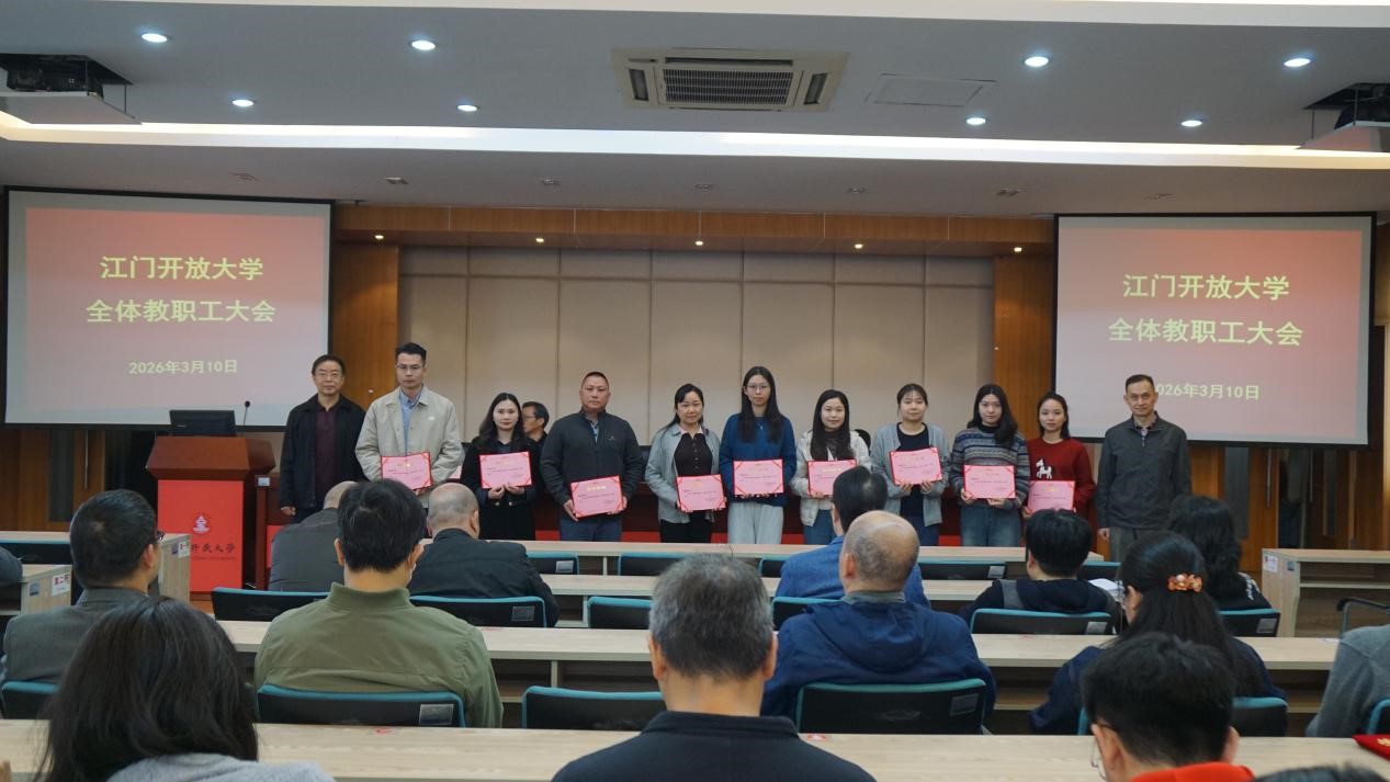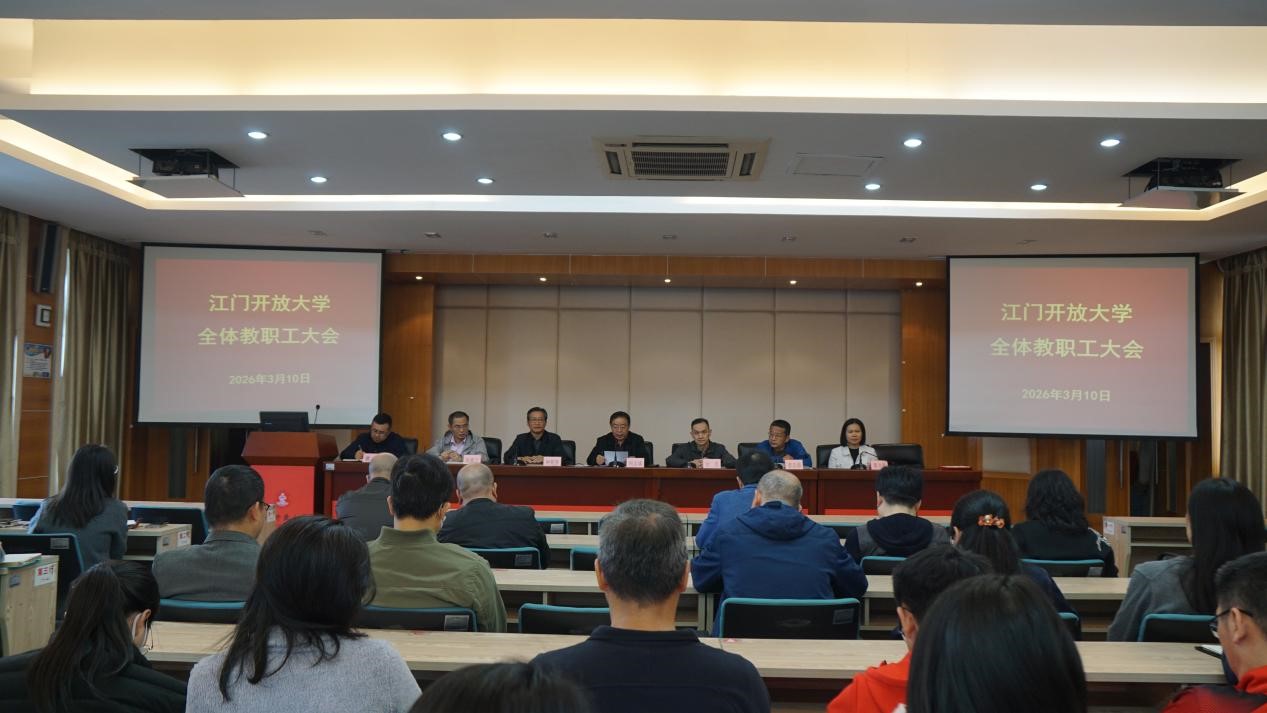 【党政办公室 梁少媚报道】3月10日,江门开放大学召开新学期全体教职工大会。党委书记何志斌主持会议,党委副书记、校长甘昱作讲话,领导班子成员及全体教职工参加了会议。